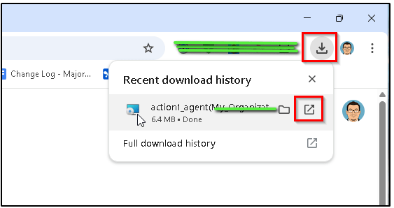 After clicking the link I sent you in an email, the action agent should download on your computer. As seen in the screenshot to the left, click on your downloads in the upper right corner and select the open icon.